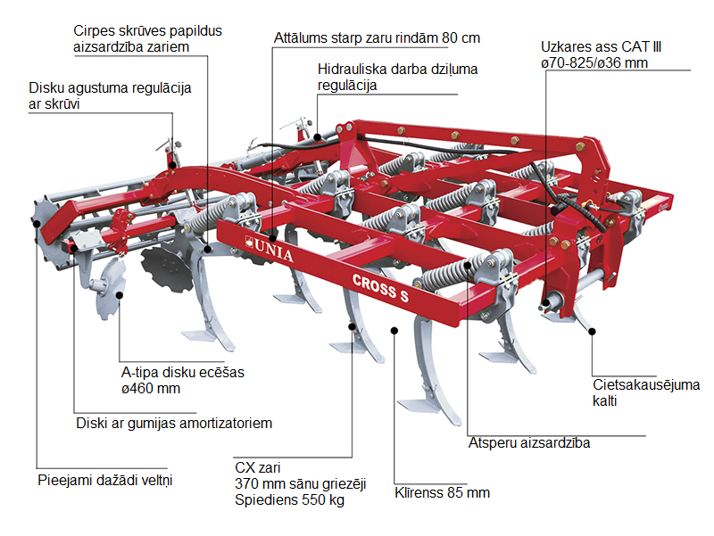 Zari aprīkoti ar vērstuvi, sānu zariem nogriezējvērstuve. Ar sānu griezējiem darba dziļums 15 cm, bet noņemot sānu griezējus līdz 30 cm.