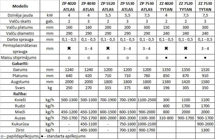 - Lai apmierinātu klientu vēlmes, tiek piedāvti 8 graudu placinātāju modeļi, kas atšķiras pēc: