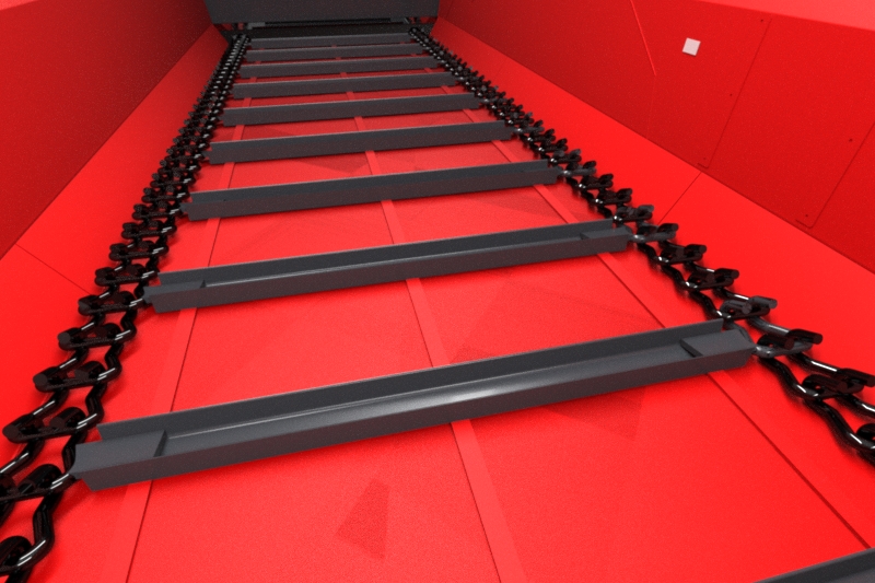 Aizbīdņa apakšējā daļa ir pastiprināta, lai izsargātos pret deformāciju no spiediena, ko rada materiāls, kas spiežas pret aizbīdni un tā apakšmalu. Aizbīdnis atveras pāri Tecamid slīdņiem, kas samazina berzi un nodrošina materiāla neizbiršanu. Aizbīdņa apakšā piestiprināta gumijas blīve, kas ir profilēta apkārt ķēdei, lai noblīvētu kravas kasti.