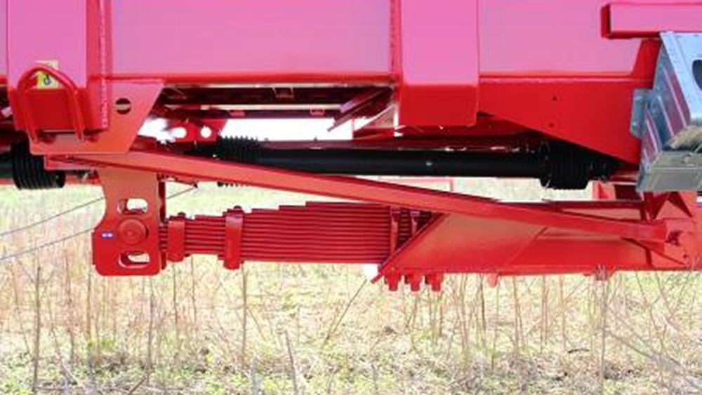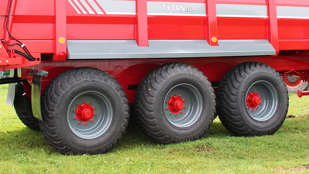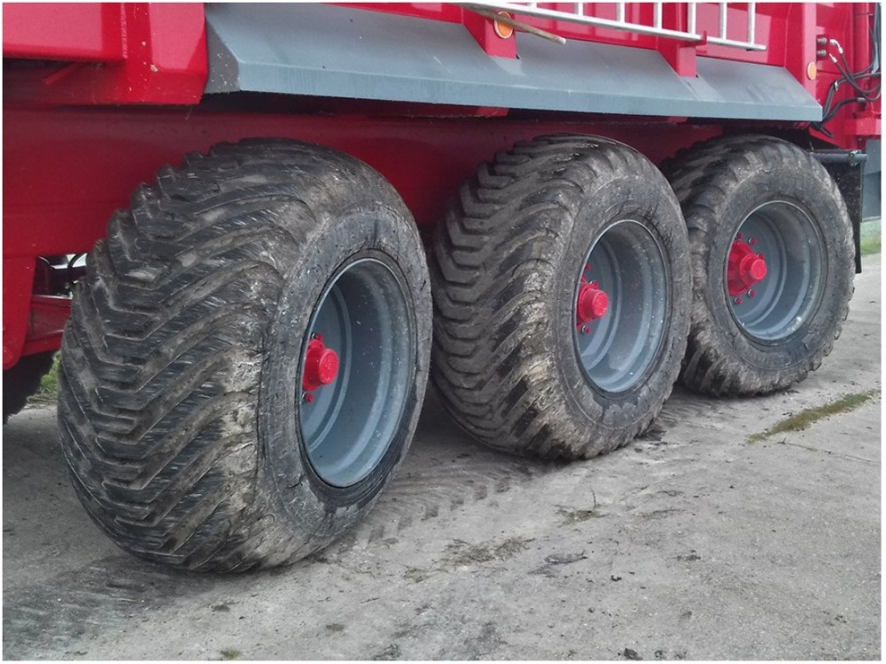 Tridem šasija. Trīsasu piekare ļauj izkliedētājam strādāt pat smagos lauka apstākļos. Pirmā un trešā ass ir stūrējošas, lai lauka galos būtu iespējams apgriezties ar mazāku rādiusu.