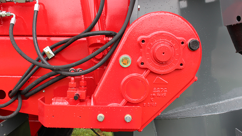 Hidrauliskā transportieru piedziņa tiek nodrošināta ar ātrumkārbu, kas ir paredzēta lielām slodzēm. Šis piedziņas veids garantē vienmērīgu materiāla padošanu uz izkliedēšanas adapteri.